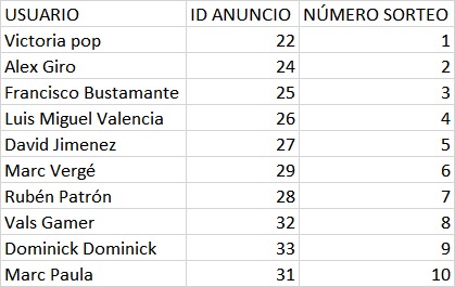 Gracias por vuestro tiempo y por participar en nuestro primer concurso. Como habéis sido varios los acertantes del concurso, vamos a proceder a realizar un sorteo. En la imagen podréis ver los acertantes a los que se le ha asignado un número del 1 al 10 con el que participarán en el sorteo.