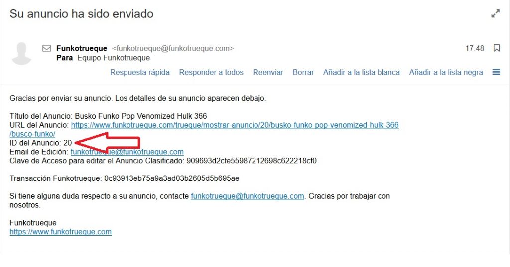 -Las respuestas se tendrán que enviar a funkotrueque@funkotrueque.com, en el asunto indicar concurso funkotrueque. En el correo, ademas de la respuesta, tenéis que poner vuestro nombre o alias con el que queráis ser identificados. También teneis que poner la ID del anuncio (marcado con flecha en el ejemplo de abajo, este os llegara en respuesta cuando publiques el anuncio.